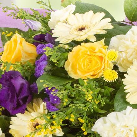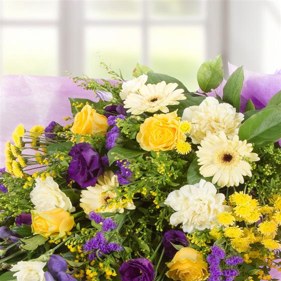 A traditional style bouquet of golds and purples including roses, lisianthus, mini gerberas and solidaster.