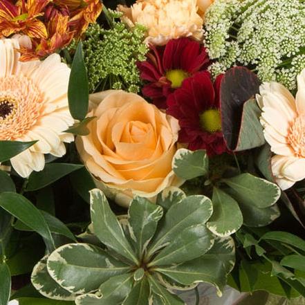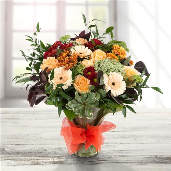 Peaches, rusts and reds combine with autumnal foliage to create this timeless hand-tied bouquet.