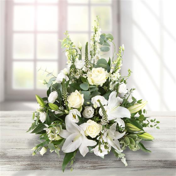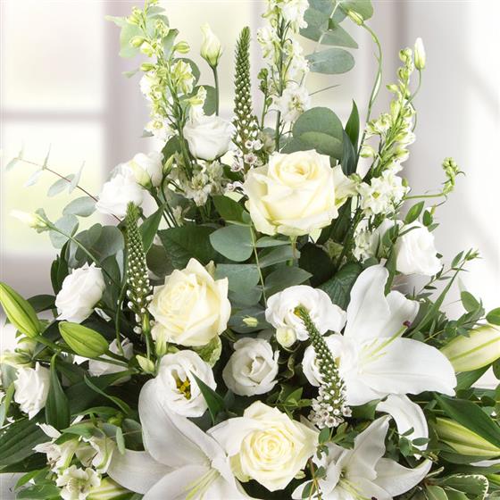 A front facing arrangement of white and cream blooms including roses, scented lilies and lisianthus.